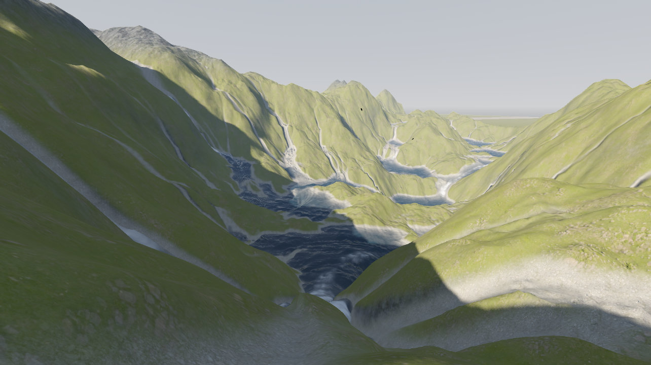 The terrain itself is generated in multiple passes in the compute shader. First, the base heightmap is generated via an FBM of Perlin noises (just like the original implementation). Then the erosion iterations take place, before finalizing all the textures in the final 2 stages of the compute shader. I don't know whether this was the best approach for a multi-pass execution but hey, it works.